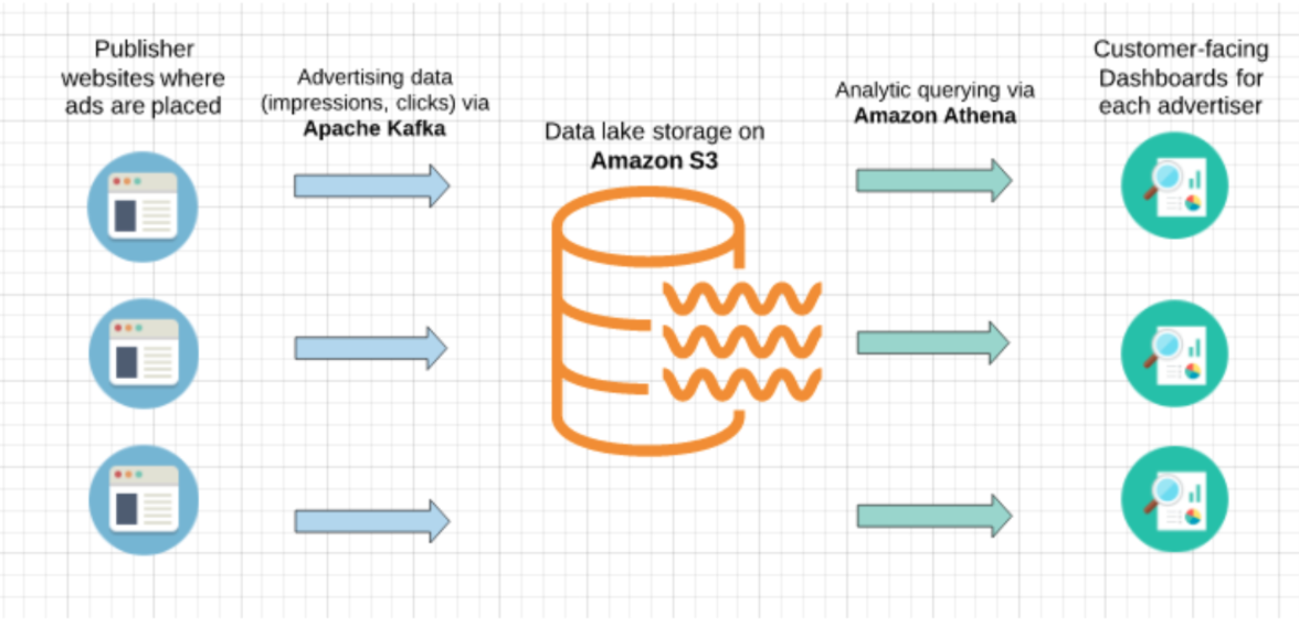 Let’s take a hypothetical scenario of an advertising technology company that programmatically places ads in real-time. The company works with many different advertisers and its ad units appear on different publisher websites. Apache Kafka is used to process ad-impression and ad-click streams generated by the ad unit on publisher websites, and the data is then written to S3.