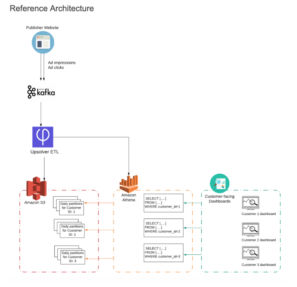 In this article we will present a solution for building performant embedded analytics on streaming data using Amazon Athena. Upsolver will be used to ETL and partition the data on S3, which will help us run more efficient queries in Athena and ensure there is no intermingling of customer data in the dashboard that each customer sees.