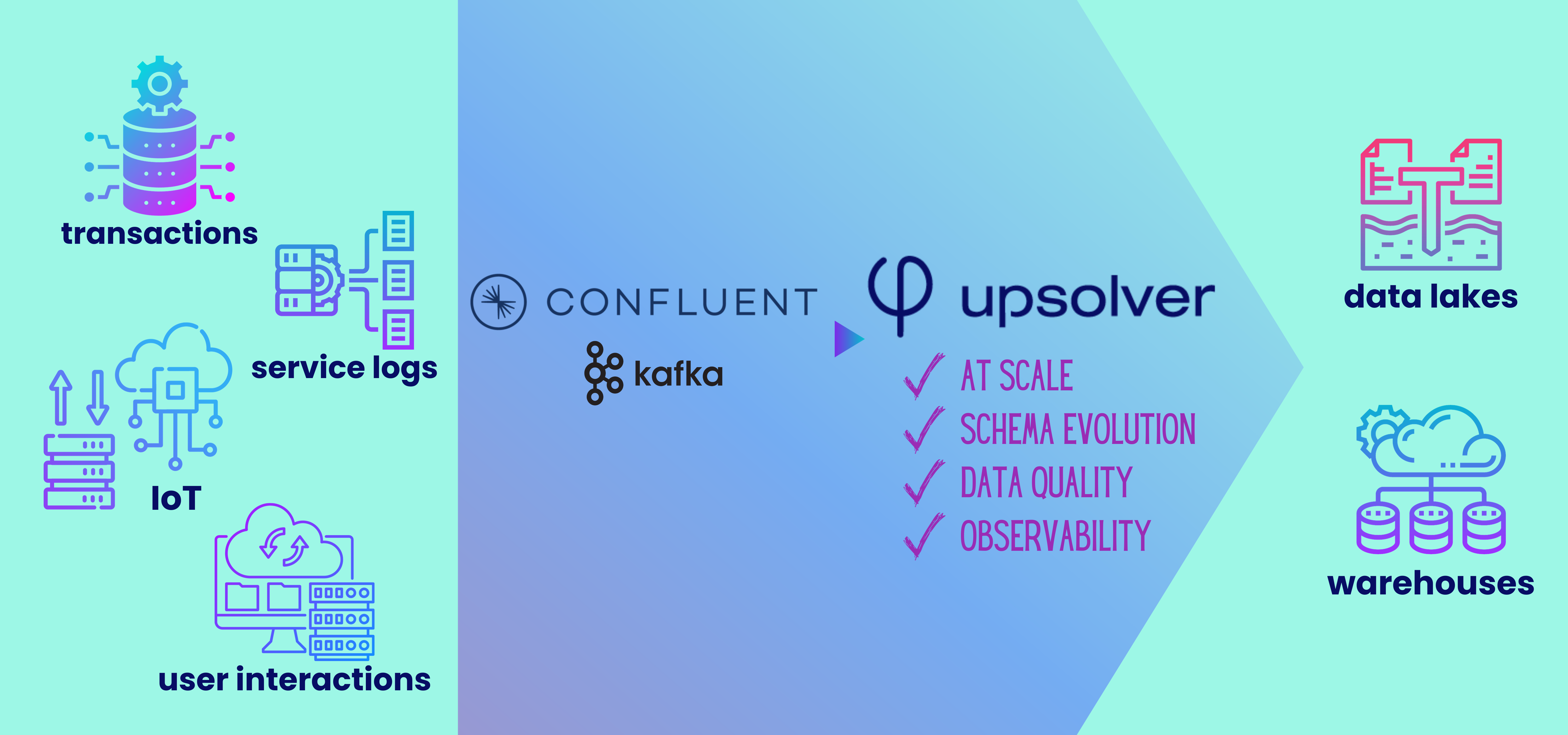 Confluent makes it easy to stream data out of your prod environment. Upsolver helps you send that data directly into the warehouse or lake with quality validation, so you can start driving value from your most differentiated data-in-motion.