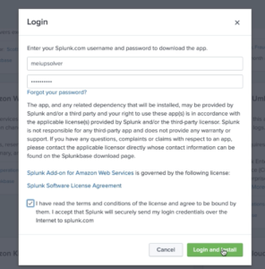 3. Fill out your login information for Splunk.com. If you don’t have an account, click on FREE SPLUNK on the upper right hand corner and signup for a free account. Check on the license and agreement box. Click on Login and Install.