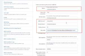 8. Give the Data input a Name. Also fill out your AWS Account information. It’s the same Account Name from step 5. Give it a Bucket Name. It has to match the bucket name on your AWS account the output data is being stored. See Step 1 (S3 Connection) from Define Amazon S3 output parameters. Change the Polling interval to 10. Define Key prefix as your S3 folder path.