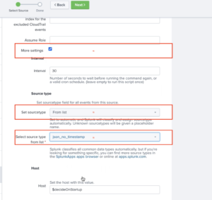 9. Scroll down and check More settings. This will provide you with additional options for settings. Change Set sourcetype to From list. From the Select sourcetype from list dropdown, select json_no_timestamp. Click on Next on the top.