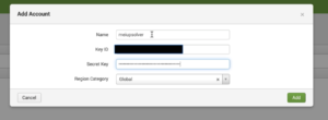 5. Give your Account a name (make sure to remember this name, we will use it for the data input next) Fill out your AWS Access Key (Key ID) and Secret Key information. Click on Add.