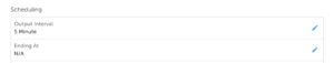 4. Under Scheduling, change the Output Interval to your desired length. This property defines how frequently Upsolver outputs the aggregated data. The default is 1 minute.