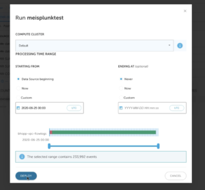 2. Define the compute cluster that you would like to use and the time range of the data you would like to output. Keep in mind that setting ENDING AT to Never means it’s a continuous stream. Click on DEPLOY.