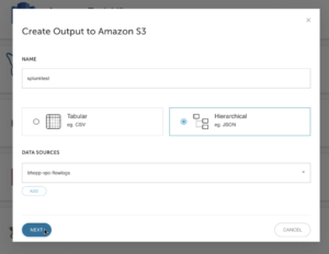 3. Give the data output a NAME and define your output format. Fill out your DATA SOURCES information. Click on NEXT to continue. (If you haven’t created a Data Source, follow this guide to create one) Keep in mind that you can infer data types when you define your DATA SOURCES.) This guide uses AWS VPC Flow Logs.